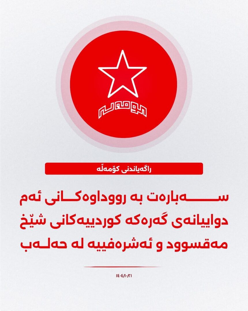 کۆمەڵەی شۆڕشگێڕی زەحمەتکێشانی کوردستانی ئێران وێڕای هاودەردی لەگەڵ خەڵکی گەڕەکانی شێخ مەقسوود و ئەشرەفییە وگەلی کورد لە ڕۆژاوا، کوشتار و گەماڕۆ و کۆچی زۆرەملێ وپێشێلکردنی ئاشکرای مافی کورد مەحکوم دەکات و هاوخەمی وسەرەخۆشی خۆی بۆ بنەماڵەی شەهیدان و هاوسەنگەرانیان ڕادەگەیەنێ.